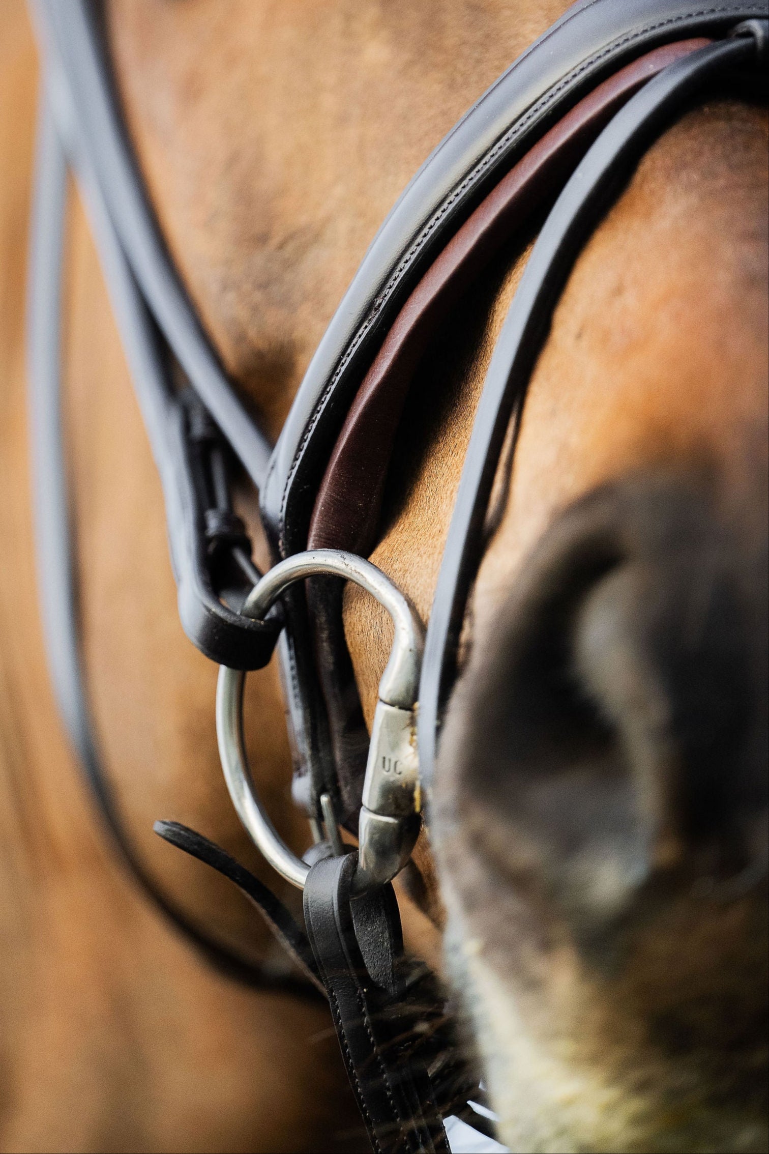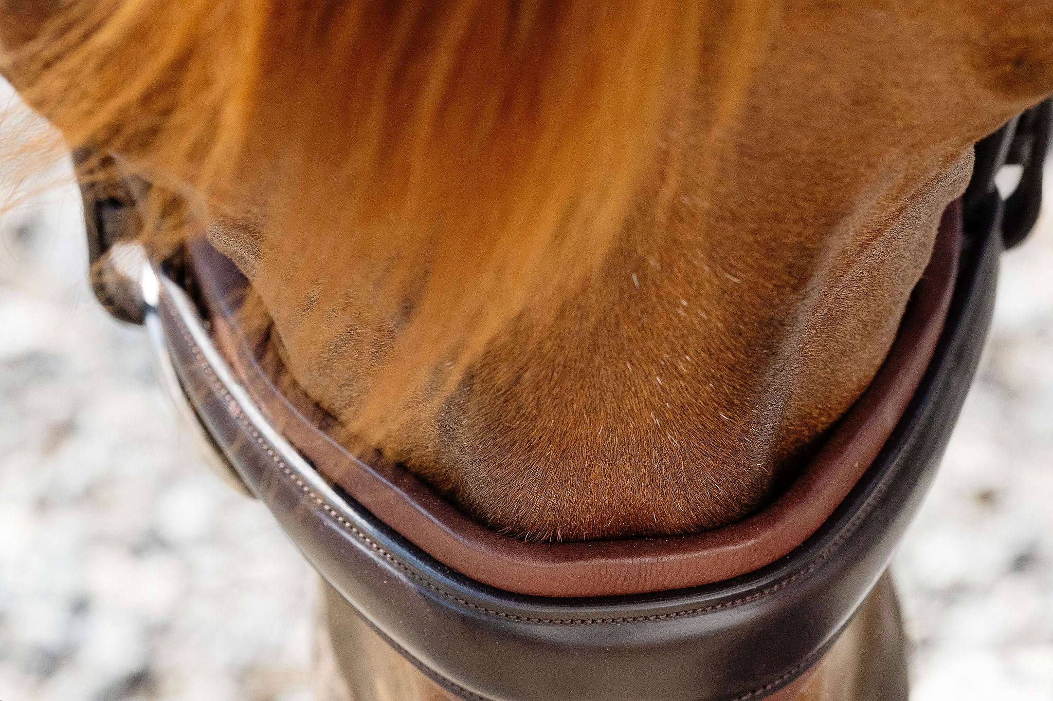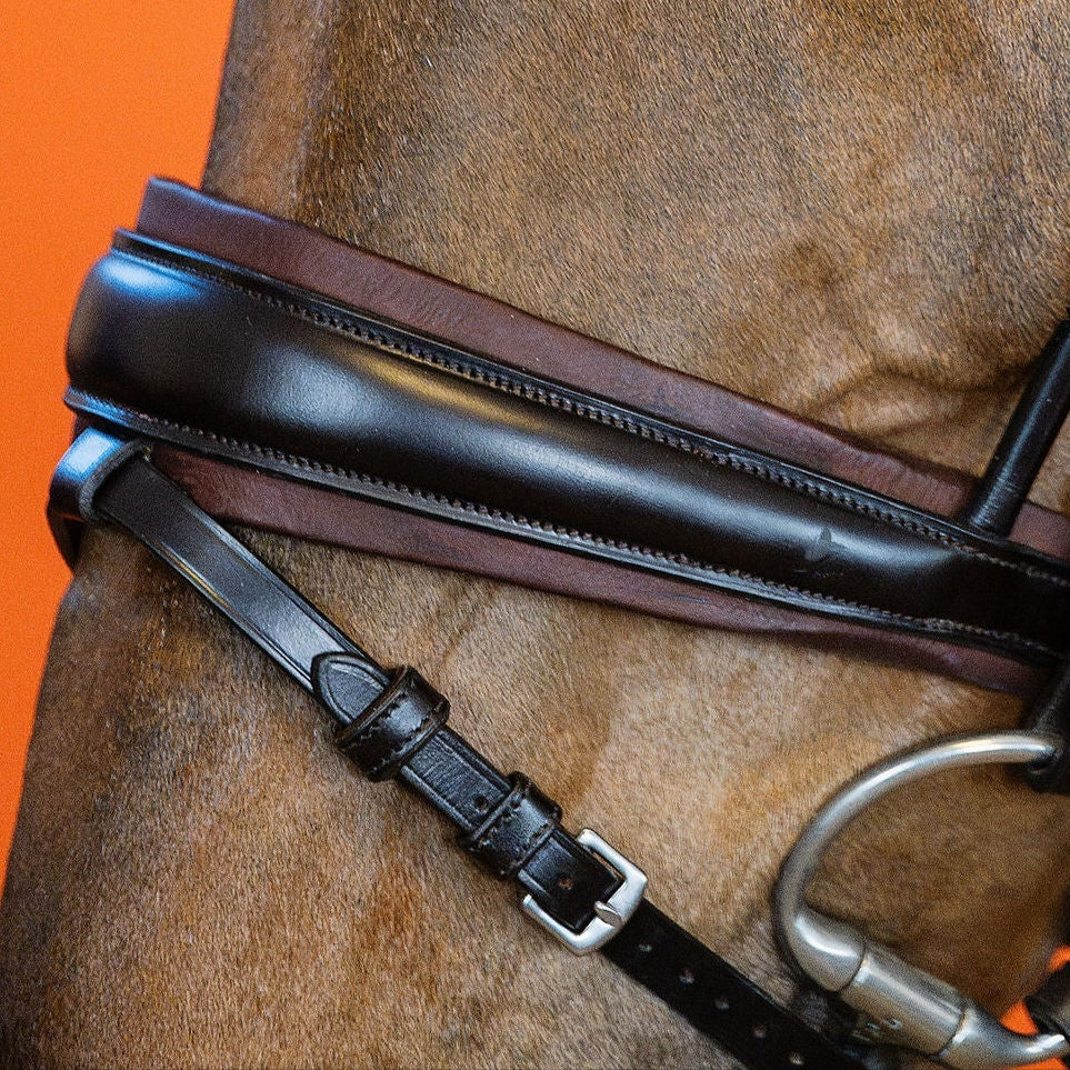 För att ytterligare förbättra komforten har vi vid kinden infört en noggrant placerad utskärning. Denna innovativa detalj eliminerar vanliga problem som klämsår och obehag, då vanliga nosgrimmor ofta trycker på tandraden. Vår design ger istället hästens kind utrymme att bukta ut naturligt, utan risk för tryck eller obehag.