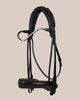 Rundgenähte Kandare mit breitem, tropfenförmigem Nasenriemen. Das Oberleder ist schwarz, die Polsterung elegant in Braun gehalten. Das Genickstück verfügt über feste, zentrierte Befestigungen, die sich nicht bewegen können, wodurch die Mikrorotation entfällt, die sonst entsteht, wenn Schnallen während der Arbeit verrutschen oder verstellt werden. Das Ergebnis ist ein selbstbalancierendes Zaumzeug, bei dem die Kräfte gleichmäßiger zwischen rechter und linker Seite verteilt werden.