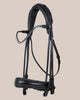 Rundgenähtes Kandare mit breitem, tropfenförmigem Nasenriemen und schwarzen Kristallen. Das Kandare verfügt über feste, zentrierte Befestigungen, die sich nicht bewegen können, wodurch die Mikrorotation entfällt, die sonst entsteht, wenn Schnallen während der Arbeit rutschen oder verstellt werden. Das Ergebnis ist ein selbstbalancierendes Zaumzeug, bei dem die Kräfte gleichmäßiger zwischen rechter und linker Seite verteilt werden.